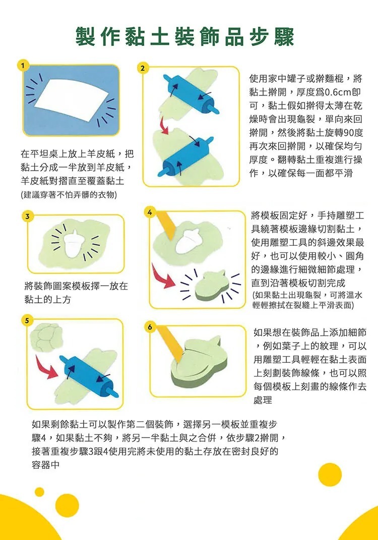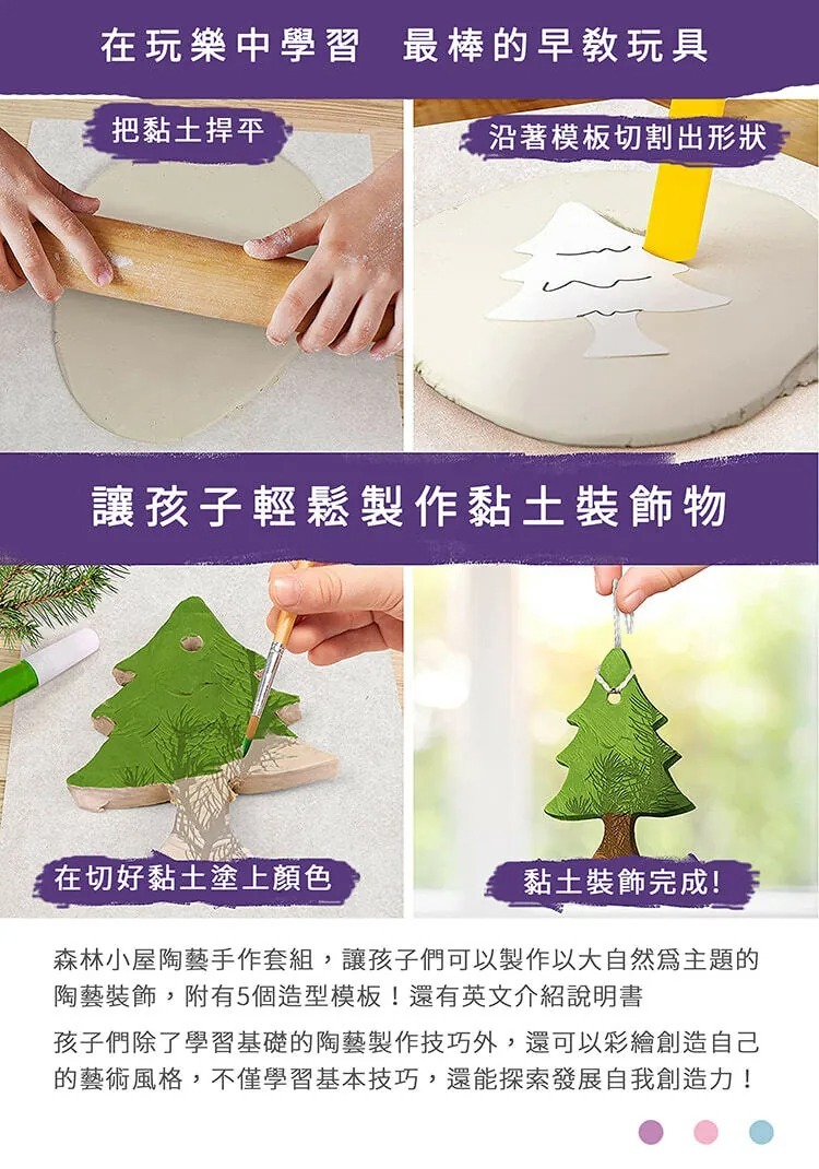森林小屋陶藝手作套組,讓孩子們可以製作以大自然為主題的陶藝裝飾,附有5個造型模板!還有英文介紹說明書