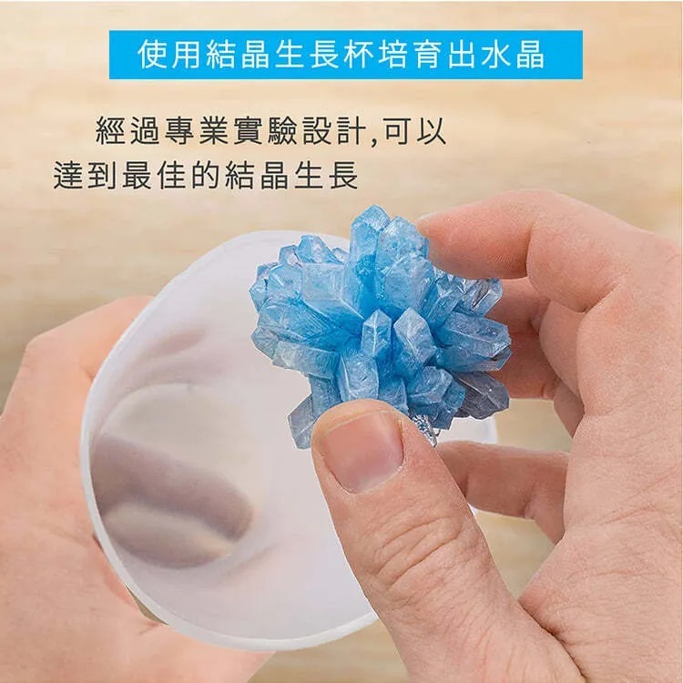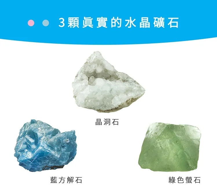晶透奇蹟(水晶栽種實驗室)科學套裝包括3種不同顏色的結晶粉末、3顆種子岩石、水晶培養杯、攪拌匙、放大鏡和3顆真實水晶(晶洞石、綠色螢石和藍色方解石)