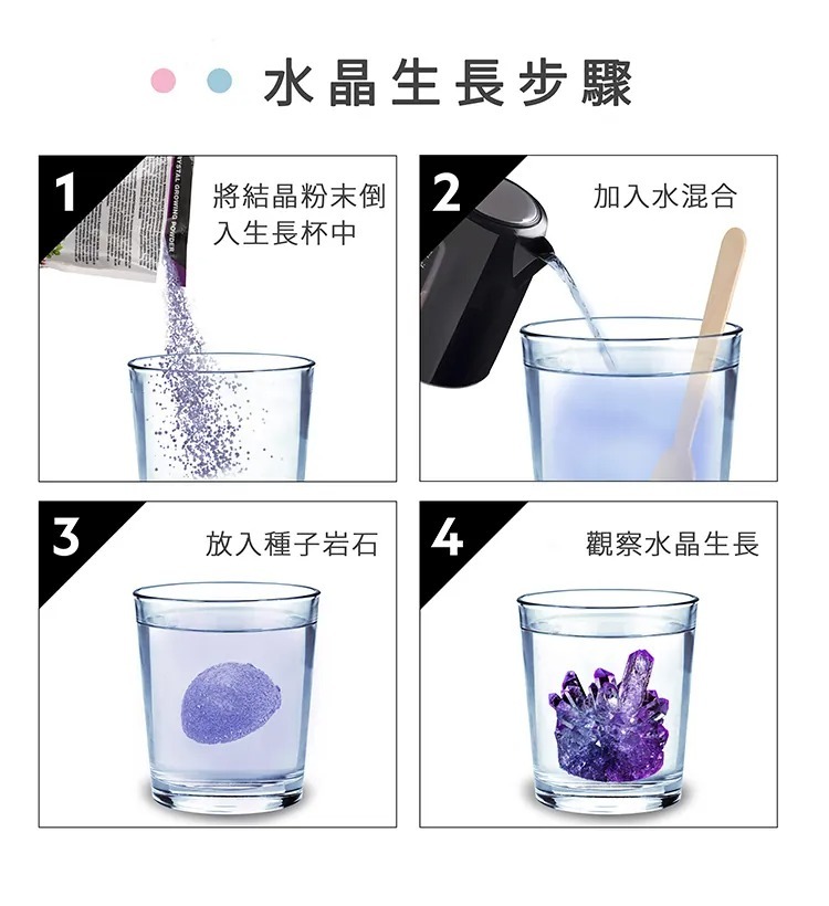 混合結晶生長粉跟水時,攪拌請用滾燙的熱水(90度)才能成功培育出水晶