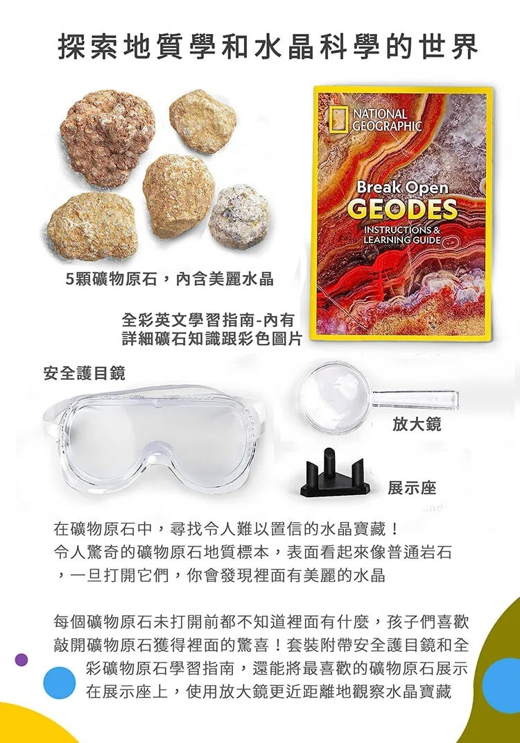 套裝附帶安全護目鏡和全彩礦物原石學習指南,還能將最喜歡的礦物原石展示在展示座上,使用放大鏡更近距離地觀察水晶寶藏