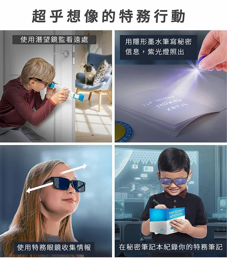 讓孩子用隱形墨水筆寫出看不到字的秘密文件,在紫光燈照射下會神奇的出現隱藏文字,這時再使用解碼輪盤破解上面的秘密,當監視目標出現後,戴上間諜眼鏡,使用潛望鏡從遠方偷偷觀察,孩子就是家裡的神秘小小特務