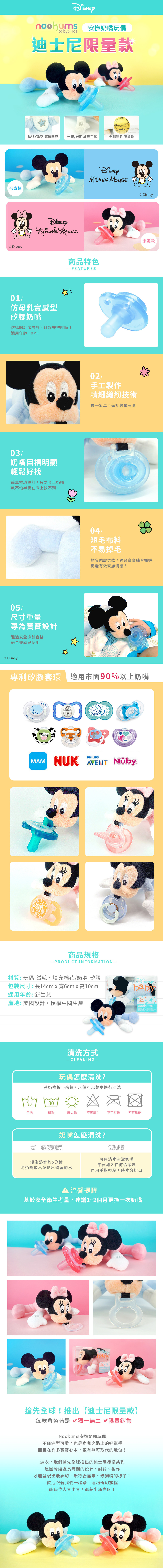 清洗方式:奶嘴與玩偶清洗前請先拆開,奶嘴可使用一般方式清潔,玩偶可手洗、機洗(放入洗衣袋中慢速柔洗)。不可漂白、不可熨燙、不可烘乾!