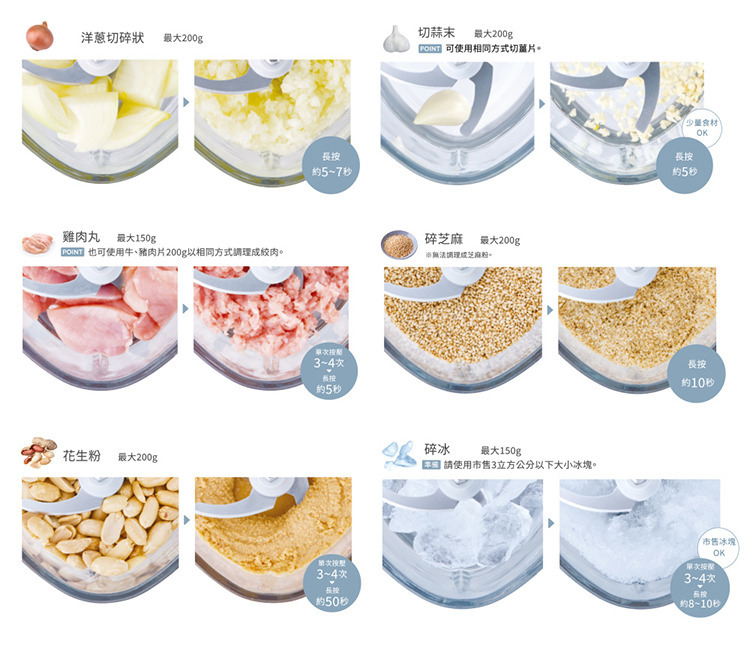 ●1機8役,切、攪拌、剁碎、揉、搗、粗磨泥、細磨泥、打發、碎冰等一機完成!