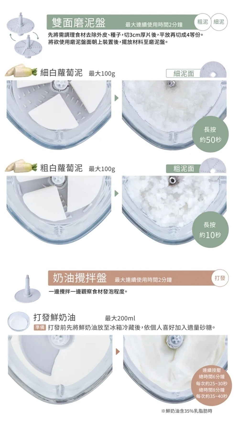 ●隨附四刃刀頭、磨泥盤、奶油攪拌盤