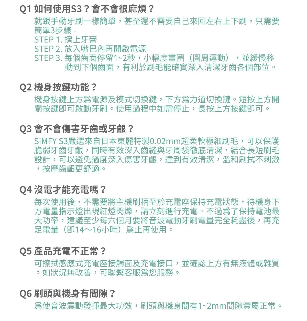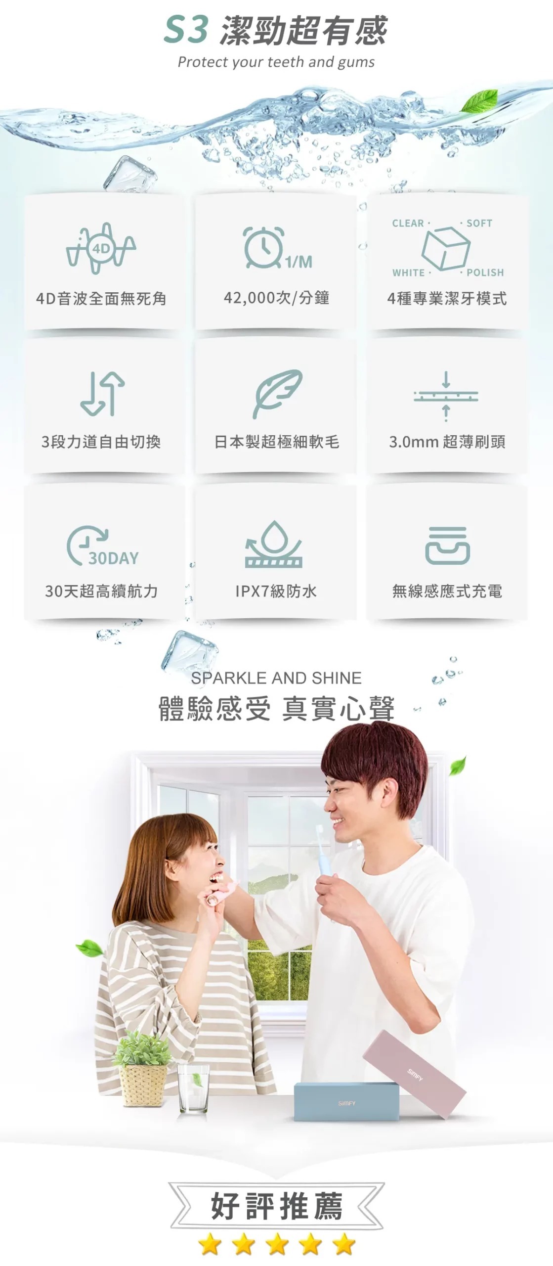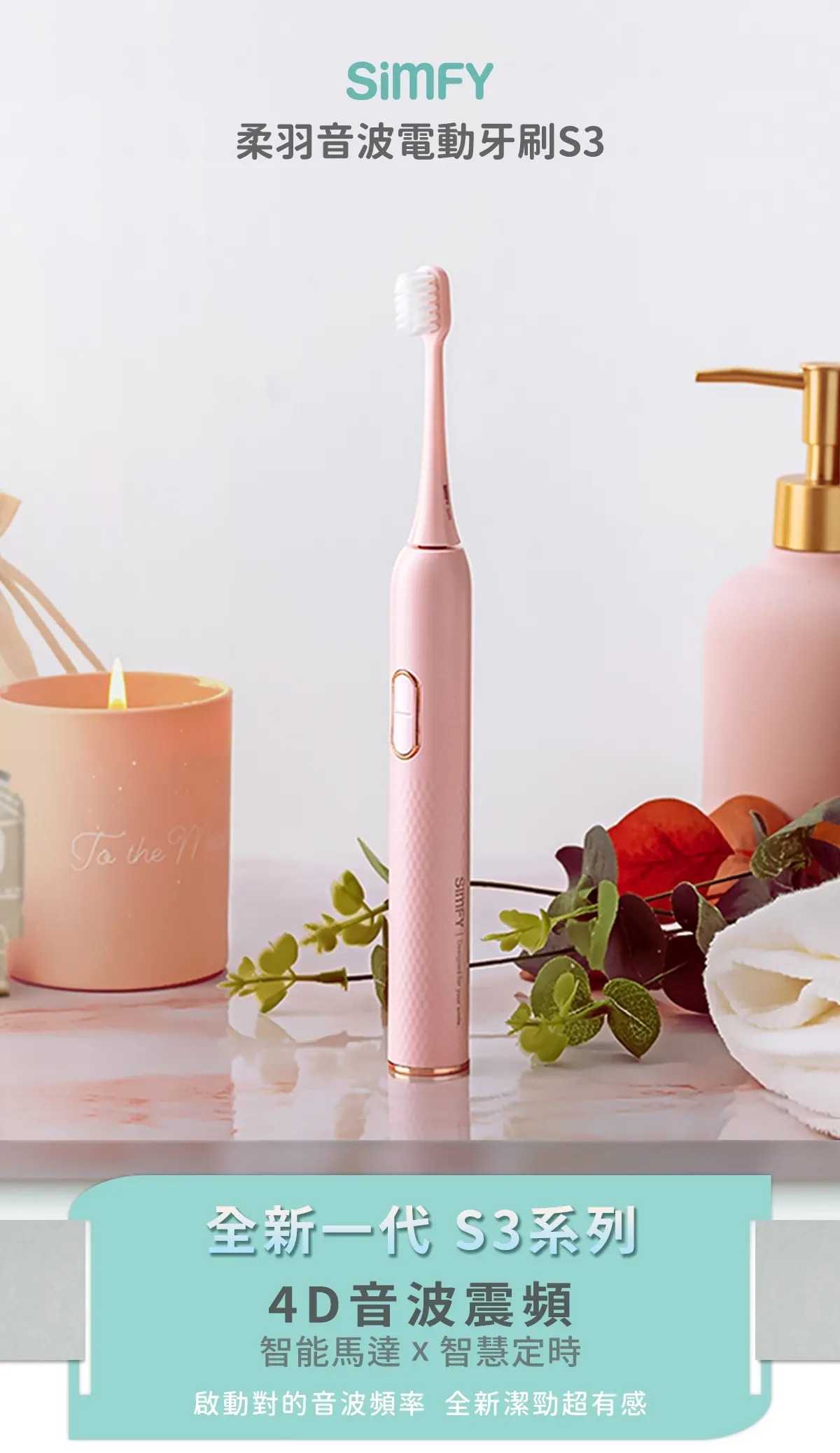 「SiMFY S3 心菲成人柔羽音波電動牙刷」符合亞洲人齒型,採用3.0mm超薄刷頭╳特殊弧型設計,更能深入齒縫,清潔無死角。內建4種專業潔牙模式 X 3段力道,搭配30秒換區,2分鐘停止的智慧提醒功能,讓口腔清潔更徹底。