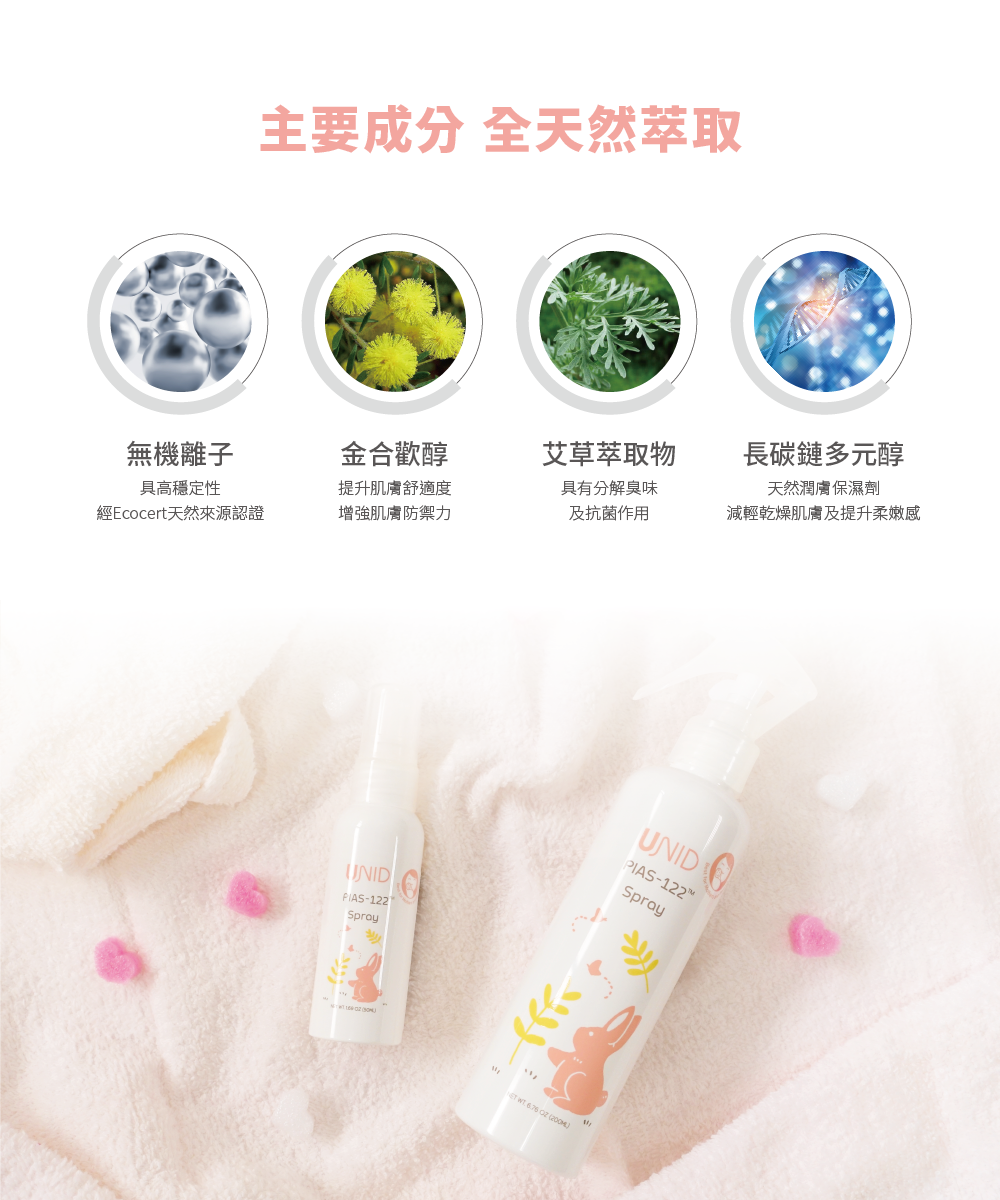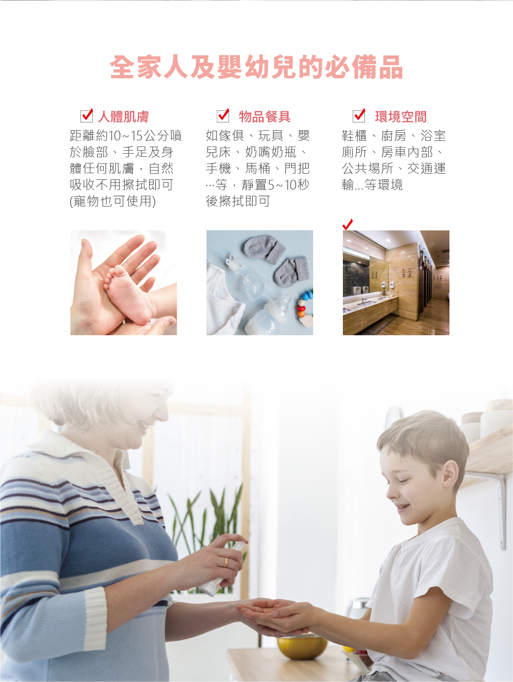 肌膚:臉部、手足、腋下及身體各部位(孕婦、嬰幼兒和毛小孩可安心直接使用 )