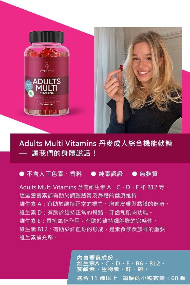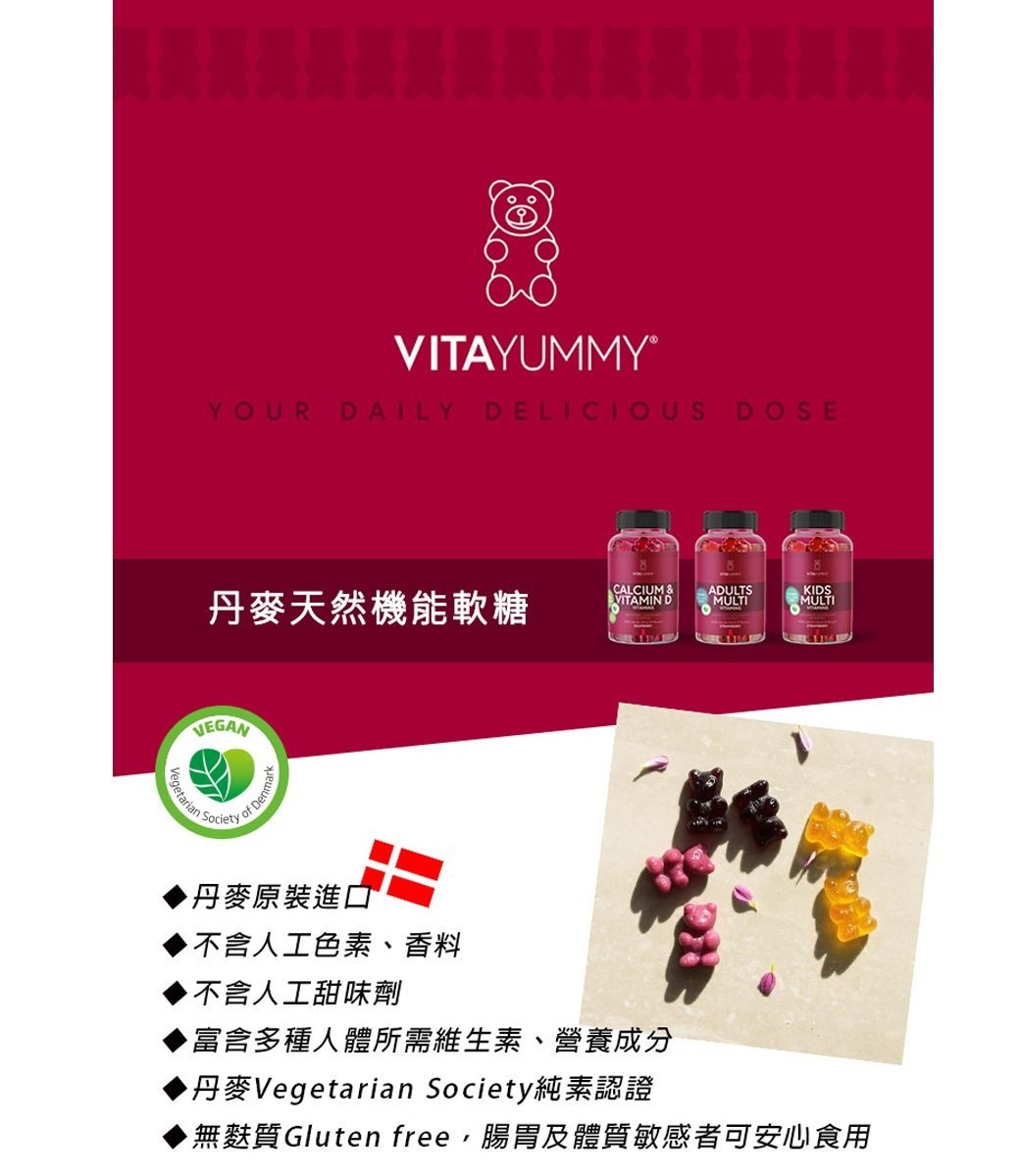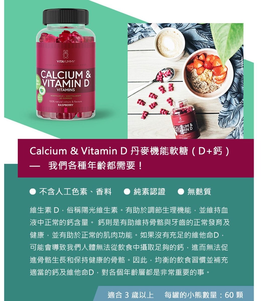 ▶️成分:葡萄糖漿,糖,果膠(蘋果),磷酸鈣,檸檬酸, 食用色素(濃縮胡蘿蔔、濃縮黑醋栗),天然覆 盆子香料,植物油(椰子油,油菜籽油),棕櫚蠟, 維生素D3