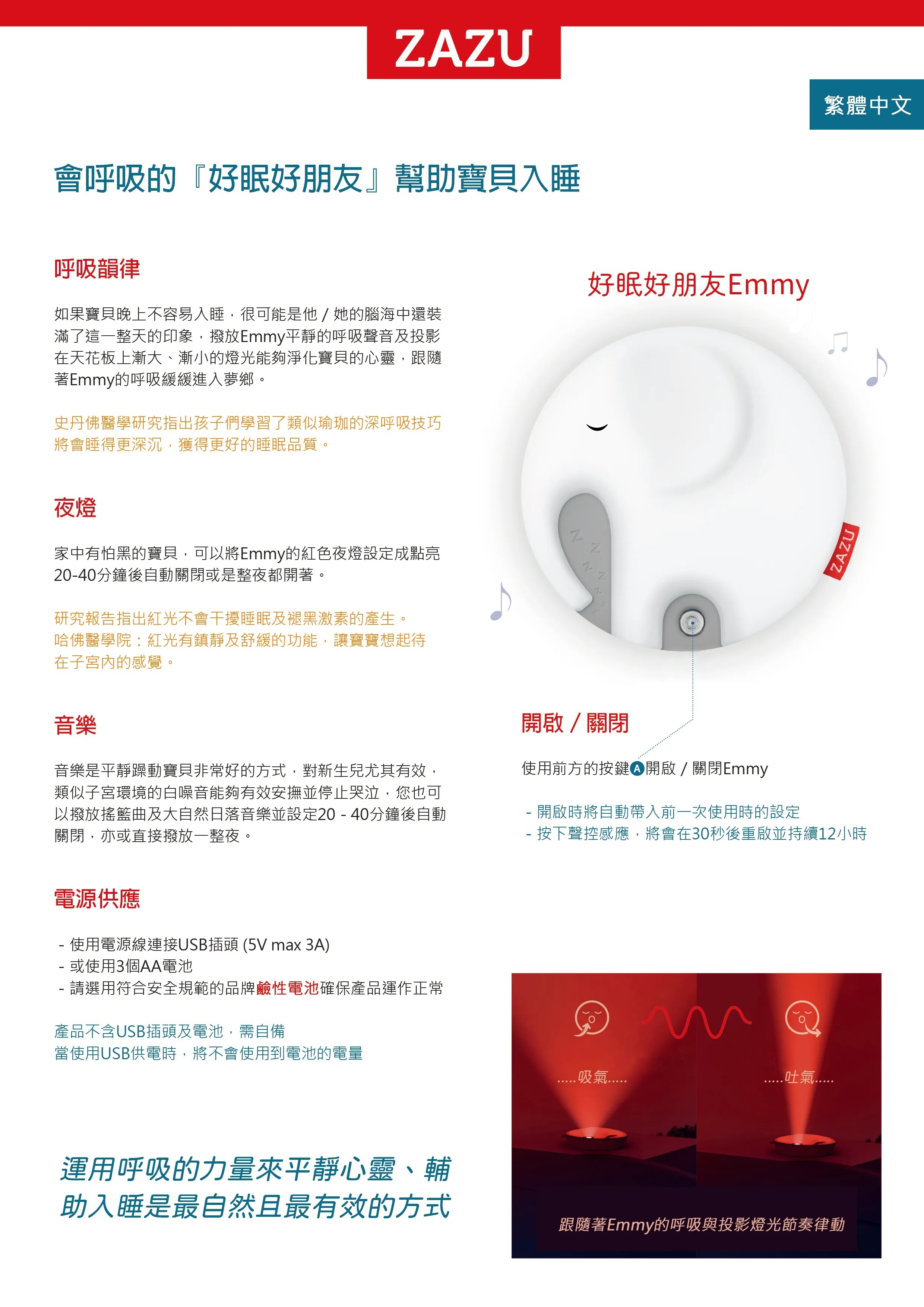 有zazu特有的哭聲感應、搭配經實驗認證、能夠安撫、平靜精神的溫暖琥珀色燈光,在睡前跟著燈光變化的頻率進行呼吸訓練、可以進行有品質的身心放鬆、增進睡眠品質。
