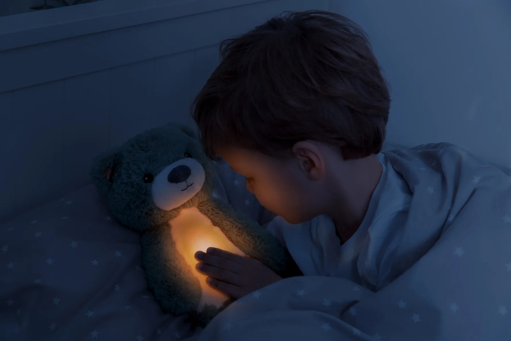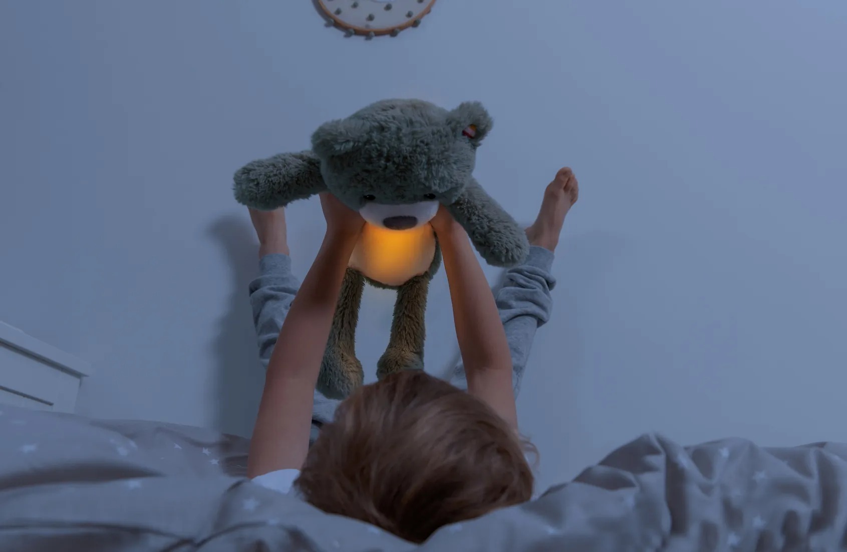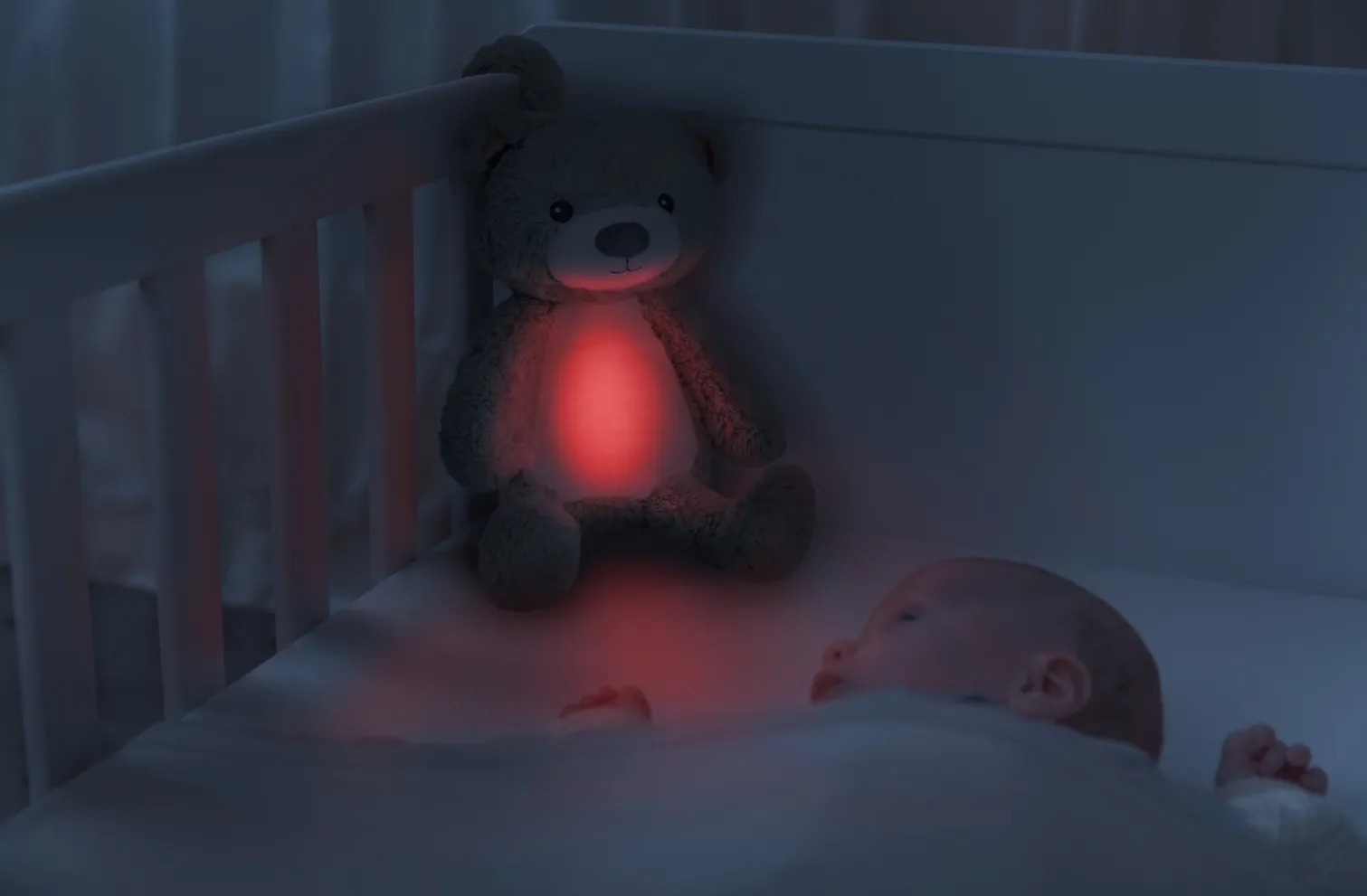在夜晚的就寢時間,睏寶好朋友的肚子會發出舒緩的紅光,並在10分鐘後自動關閉,燈光亮度可依個人喜好調整。