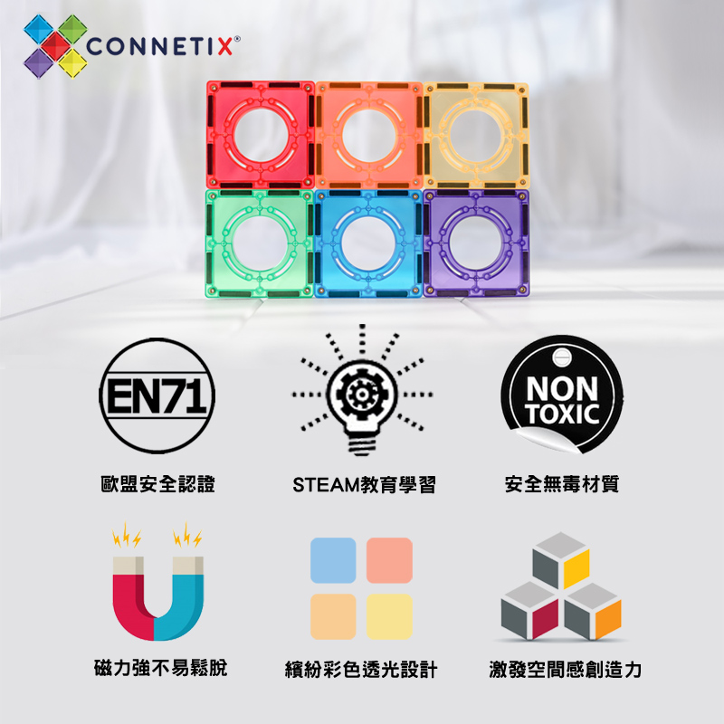 澳洲Connetix磁力積木採用無毒ABS塑料製成,不含BPA、鉛和鄰苯二甲酸鹽,所有積木都經過密封焊接及鉚釘設計強化安全性,磁力強容易組合不易鬆脫,符合歐盟EN 71安全玩具標準認證,獨特繽紛彩色透光設計,美感與趣味性兼具,2D平面、3D立體建構創造無限想像力!